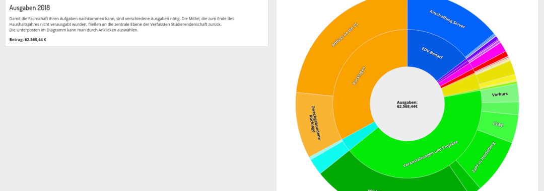 Damit die Fachschaft ihren Aufgaben nachkommen kann, sind verschiedene Ausgaben nötig. Ein transparenter Umgang mit unserem Haushalt ist uns dabei sehr wichtig. Deshalb haben wir diesen visuell aufbereitet. Im sogenannten Finance-Visualizer[1] werden alle Einnahmen und Ausgaben der Fachschaft in Diagrammen dargestellt. Durch Klicken auf die einzelnen Posten können Erklärungen angezeigt werden.